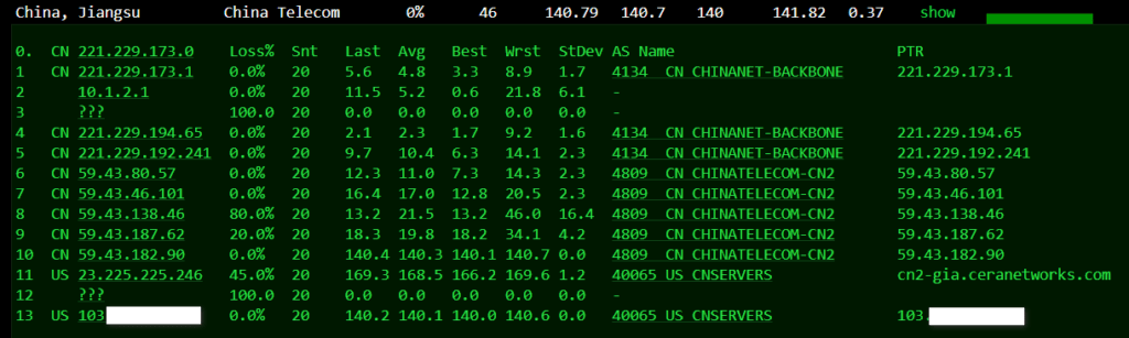 移动丢包率较高为30%左右,联通去程似乎也走CN2 GIA但是丢包率相对较高,实测回程不是走CN2 GIA